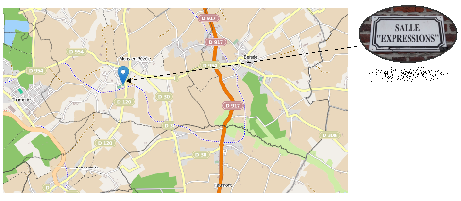 Arrivée Mons-en-Pévèle par un rond point (il n’y a qu’un seul rond point) Direction Moncheaux, rue de la Vacquerie, passer devant le cimetière, à 300 mètres à droite, juste après le terrain de foot, un petit chemin. Point de repère un vide bouteilles vert.S’engager dans cette impasse, au bout tout droit plusieurs salles, sur la droite après la grille, la « Salle Expression ».